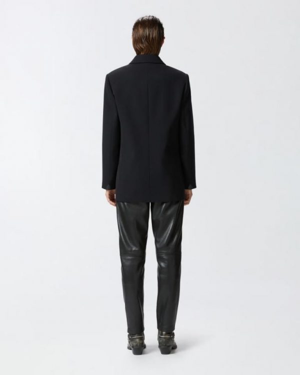 GUINEA MARYNARKA − 103695A1XXZ99 Slightly oversized, menswear-inspired blazer made from wool-blend twill fabric. This women’s blazer features a lapel collar, a small welt pocket and flap pockets at the sides. The set-in long sleeves with padded shoulders to accentuate the volume and stature of the silhouette are customised with a pointed leather-effect fabric insert. The jacket features inner lining and double-breasted button fastening that adds a touch of timeless style to an already iconic garment.