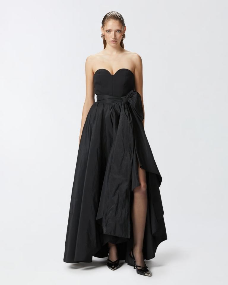 KOMBINEZON BORNEO − 100238A26QZ99 Sukienka składająca się z dwóch oddzielnych części: krótkiego kombinezonu bez rękawów i bez ramiączek, wykonanego z elastycznej krepy z dekoltem w kształcie serca i ukrytym zamkiem z tyłu, oraz eleganckiej spódnicy maxi wykonanej z tafty, o wyjątkowo szerokim kroju, która posiada krzyżowane wiązanie na szarfę w talii.