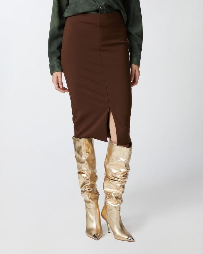 VASCA SPÓDNICA − 104134A15MI76 Spódnica średniej długości o ołówkowej linii, wykonana z technicznej elastycznej tkaniny wiskozowej o gładkim splocie, na przodzie posiada rozcięcie na zamek umożliwiający regulację głębokości. Zapięcie na kryty zamek z tyłu pośrodku.