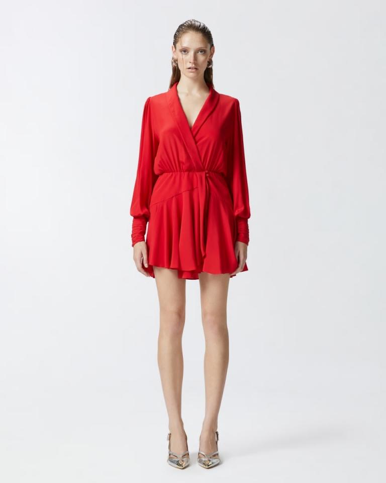 MELUN SUKIENKA − 104100A207RA1 Krótka sukienka uszyta z krepdeszynu z elastycznej jedwabnej mieszanki, wykończona głębokim dekoltem w serek. Długie rękawy zakończone szerokim mankietem z marszczeniem i guziczkami. Krótki dół o krzyżowanym kroju, zapięcie na dwa guziki w pasie.