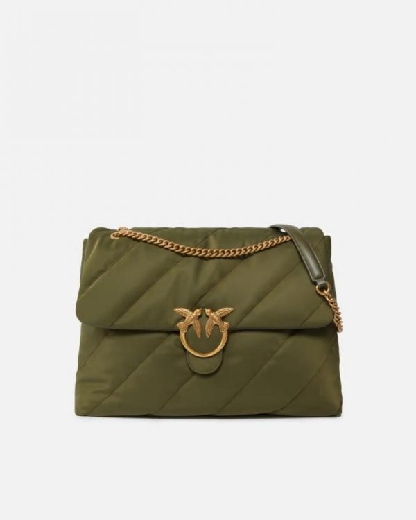 LOVE PUFF EXTRA CL − 103347A05FV68Q00001 Duża torebka z paskiem na ramię Extra Love Bag Puff, ze skośnie pikowanej tkaniny wykonanej z włókien pochodzących z recyklingu. Zapięcie z klapką uzupełniono metalową klamrą Love Birds Diamond Cut galwanizowaną w kolorze starego złota. Wnętrze wykończone poliestrowo-bawełnianą podszewką z recyklingu, posiada wygodną kieszonkę na zamek. Pasek na ramię w postaci metalowego łańcuszka z praktycznym naramiennikiem z tego samego materiału, umożliwia noszenie torebki zarówno przez ramię, jak i na ramieniu, w zależności od potrzeb. Aktywuj swoją torebkę PINKO: sprawdź autentyczność swojego produktu i dołącz do spersonalizowanych wrażeń, w tym celu zbliż swój smartfon do haftu Love Birds, który znajdziesz z tyłu torebki!