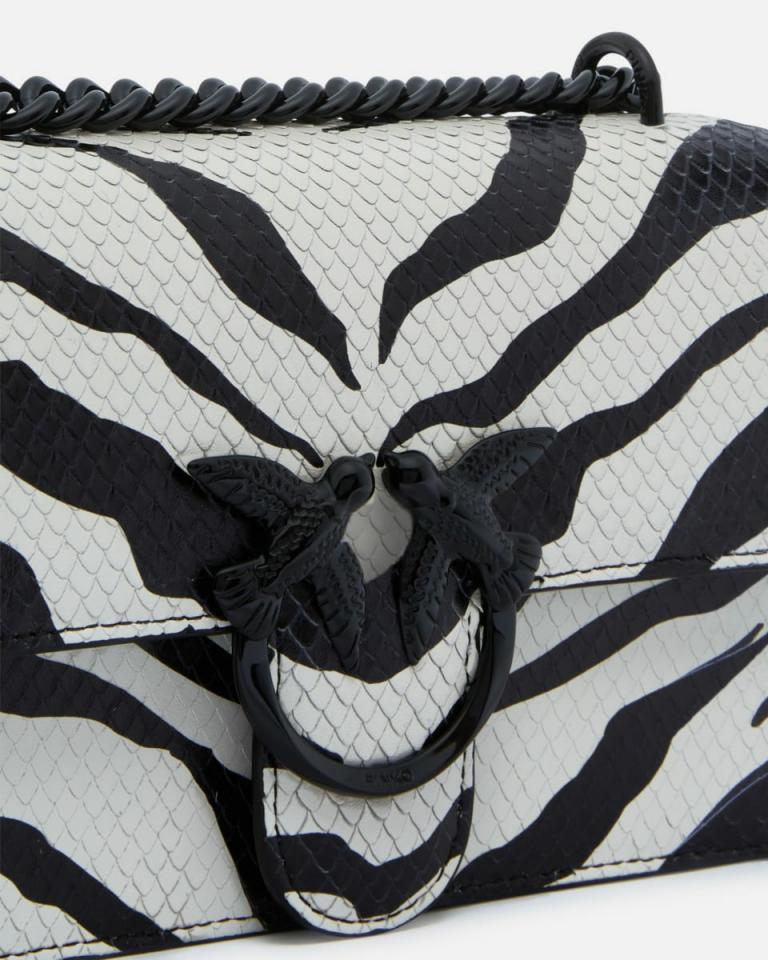 LOVE ONE MINI DC TOREBKA − 100074A1USZZ1B00001 Mini Love Bag crossbody bag in reptile-print leather embellished with striking, two-tone etched black and white zebra pattern. This rigid bag features a metal Love Birds Diamond Cut buckle, with a black enamel coating for seamless colour matching, and a practical zipped centre divider pocket and black microsuede lining inside. Thanks to its exotic pattern, this bag stands out with daytime looks and gives special evening looks a touch of originality. The sliding chain strap is accompanied by an adjustable leather shoulder pad, which can be doubled for on-the-shoulder wear. Activate your PINKO bag: verify the authenticity of your product and access a personalised experience by scanning the Love Birds embroidery on the back of the bag with your smartphone!